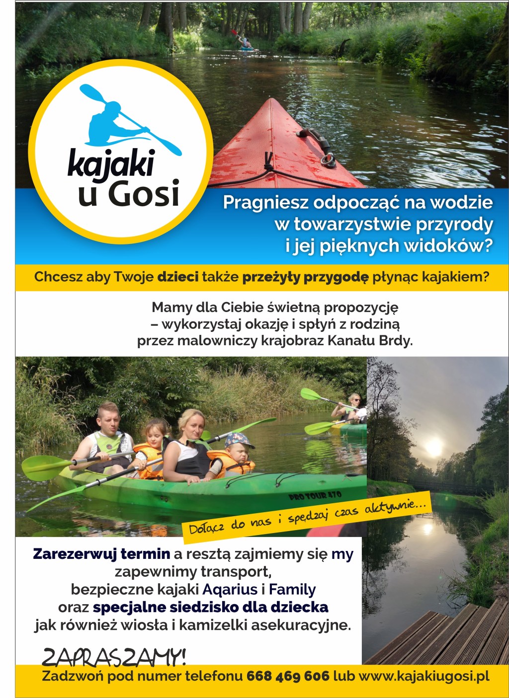 Zapewnimy transport, bezpieczne kajaki Aqarius i Family oraz specjalne siedzisko dla dziecka jak również wiosła i kamizelki asekuracyjne.